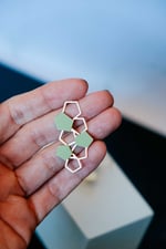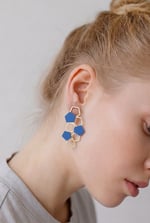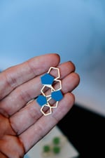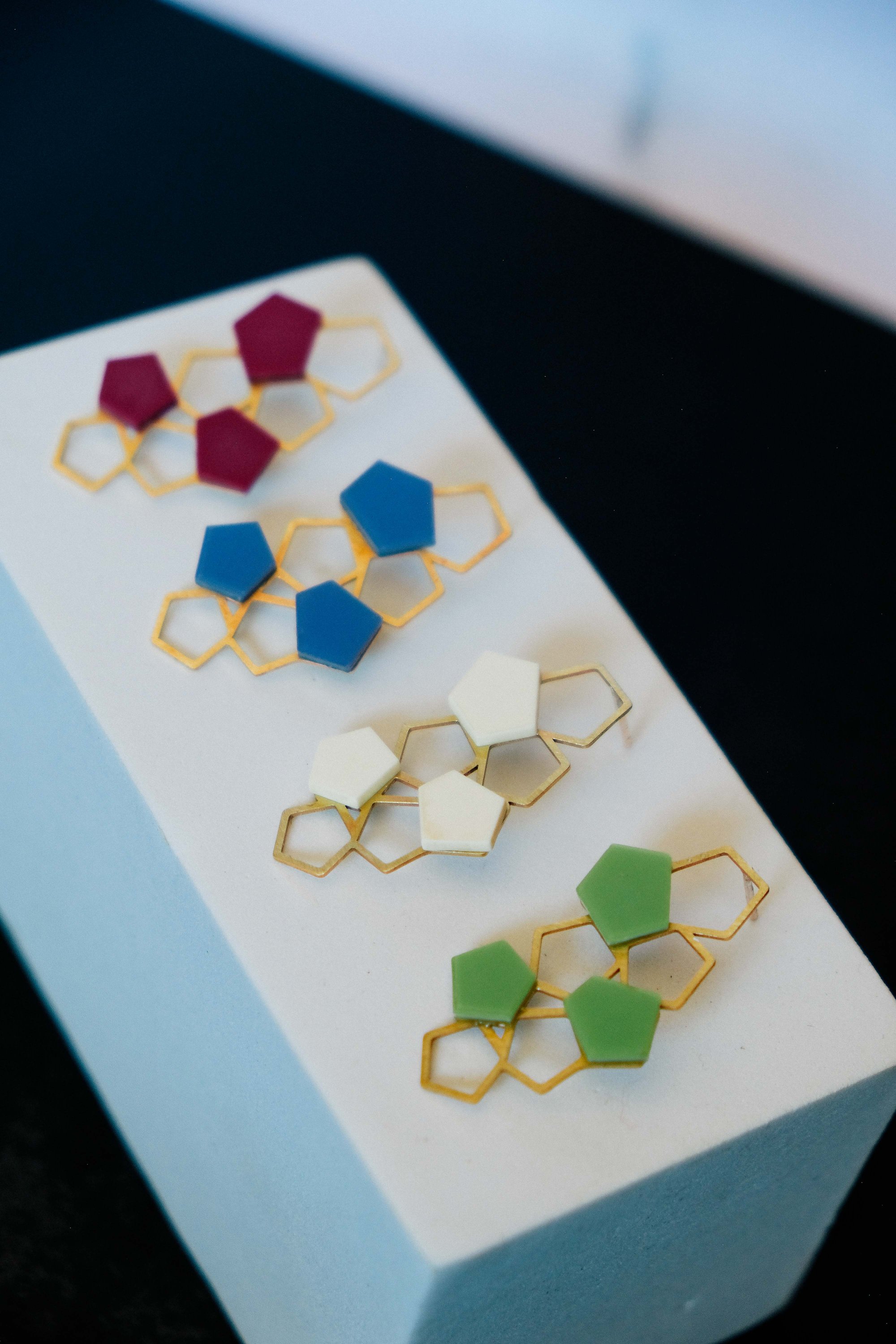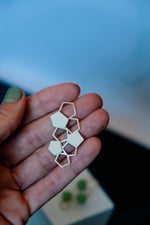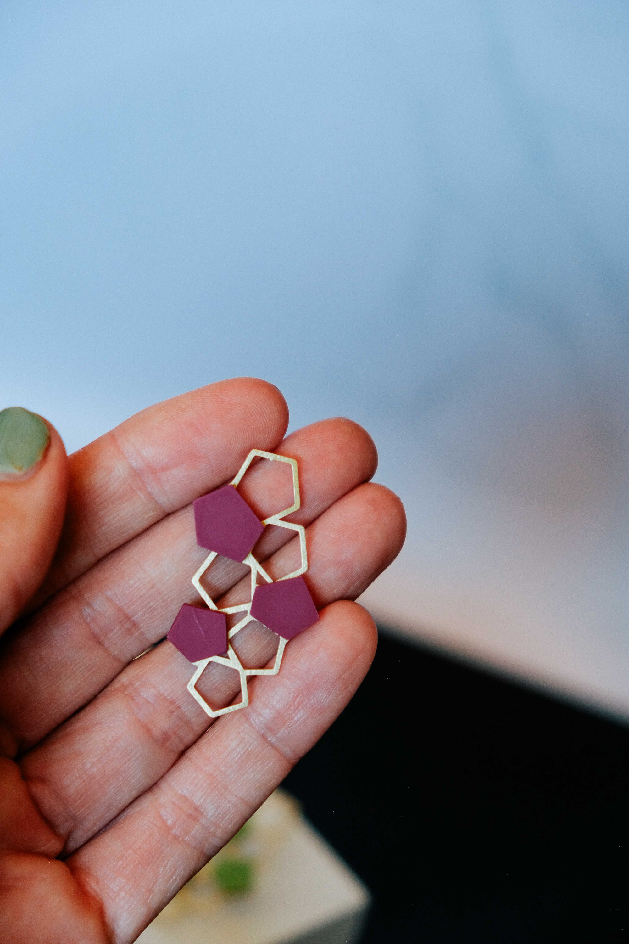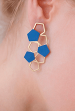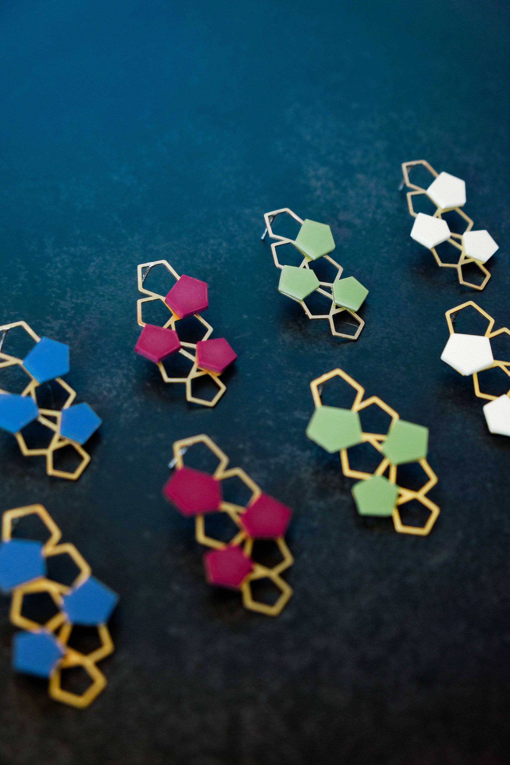 Pendientes geométricos de latón y acetato hechos a mano, ligeros y muy originales. Su composición de líneas abiertas y formas pentagonales crea una pieza modular, delicada y con un punto arquitectónico.