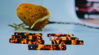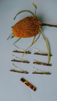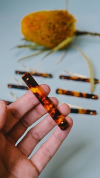 Pinzas para el pelo en acetato de celulosa con acabado mate, pulido y tratado con técnicas de joyería. Bolas de plata dorada