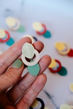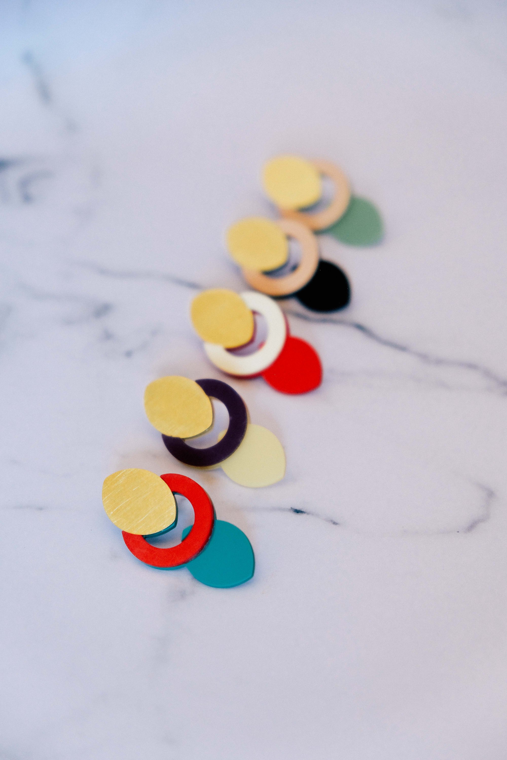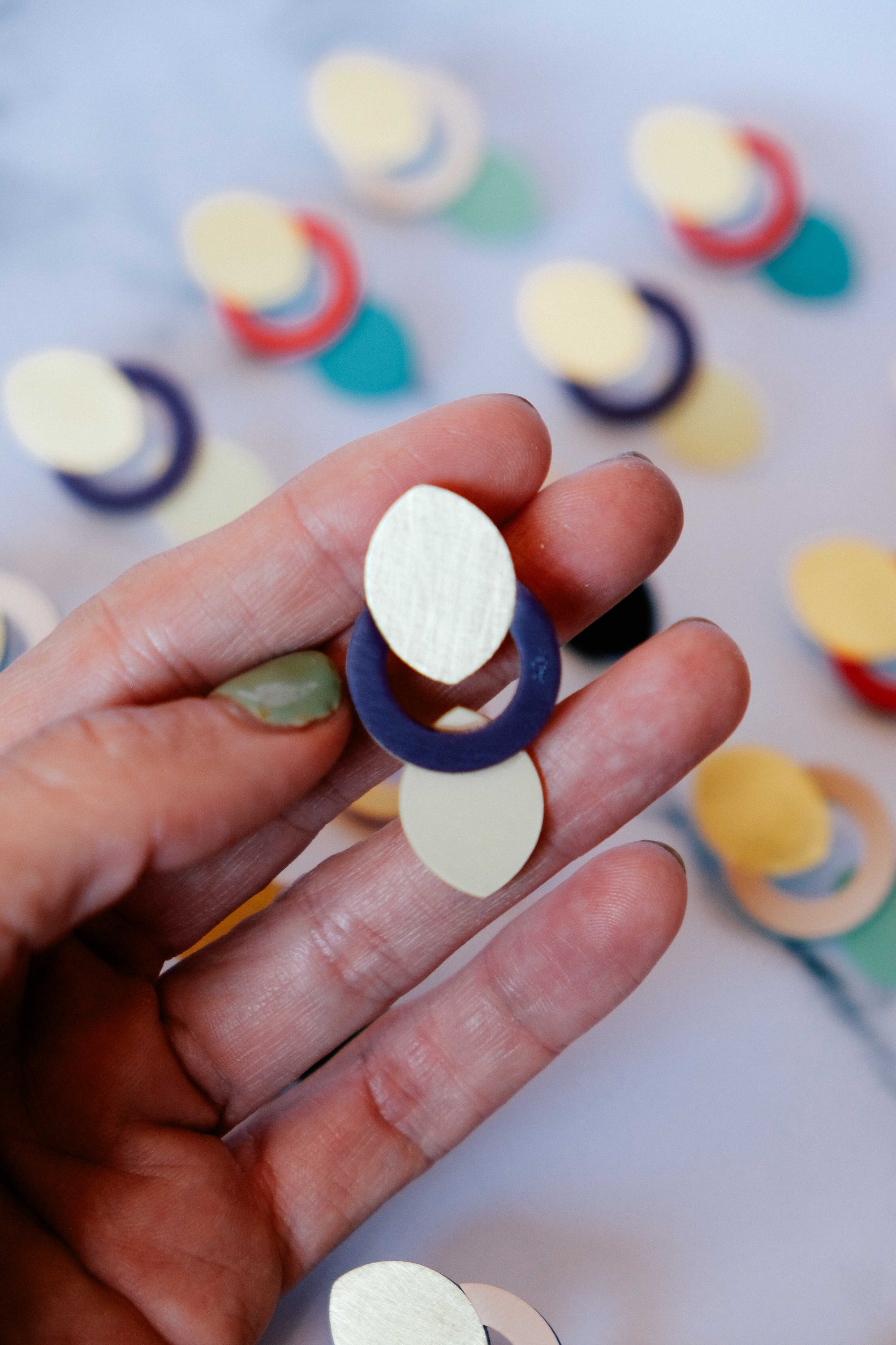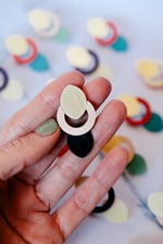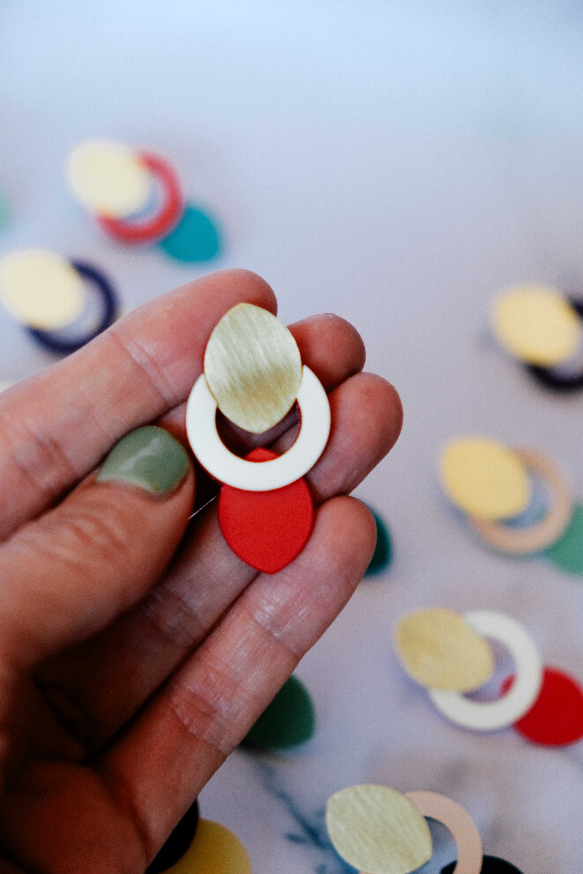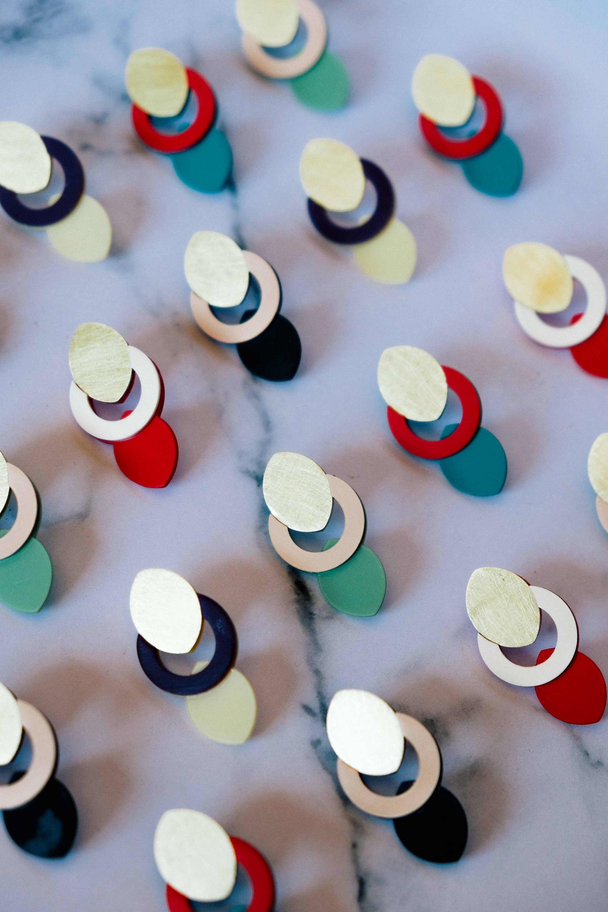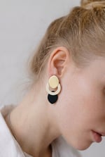 Pendientes geométricos de latón y acetato hechos a mano, ligeros y elegantes. La combinación entre círculo, vacío y forma orgánica da lugar a una pieza contemporánea con mucho equilibrio visual.