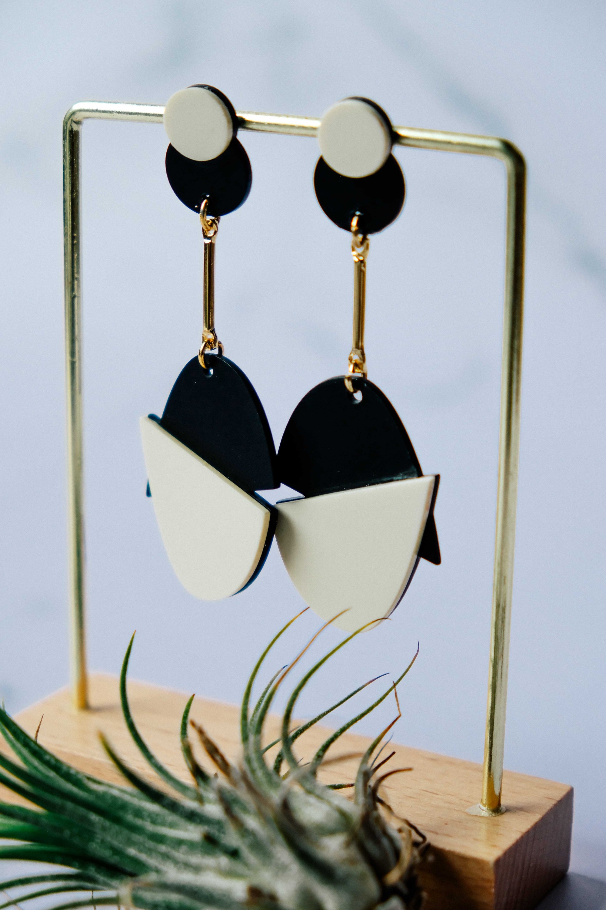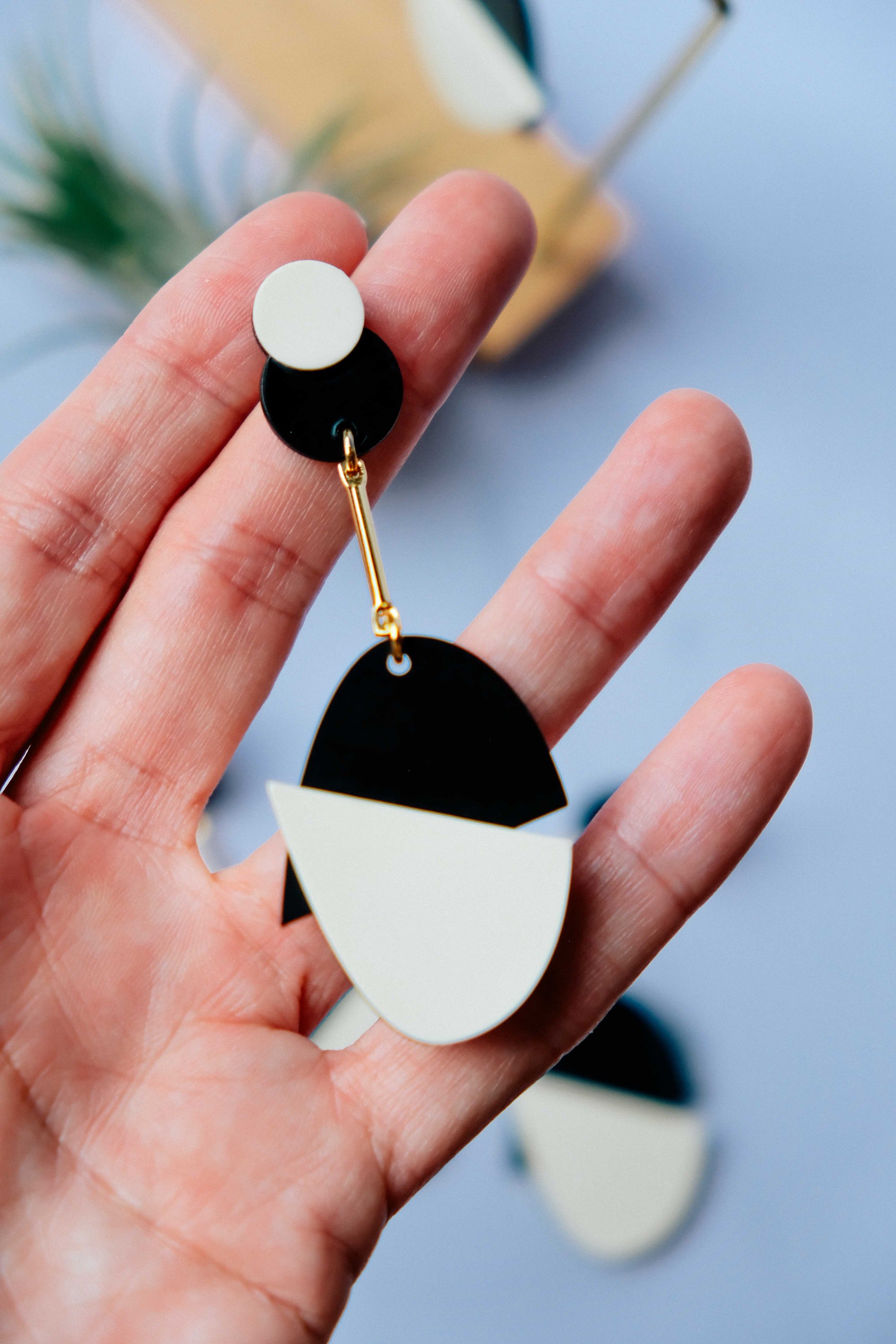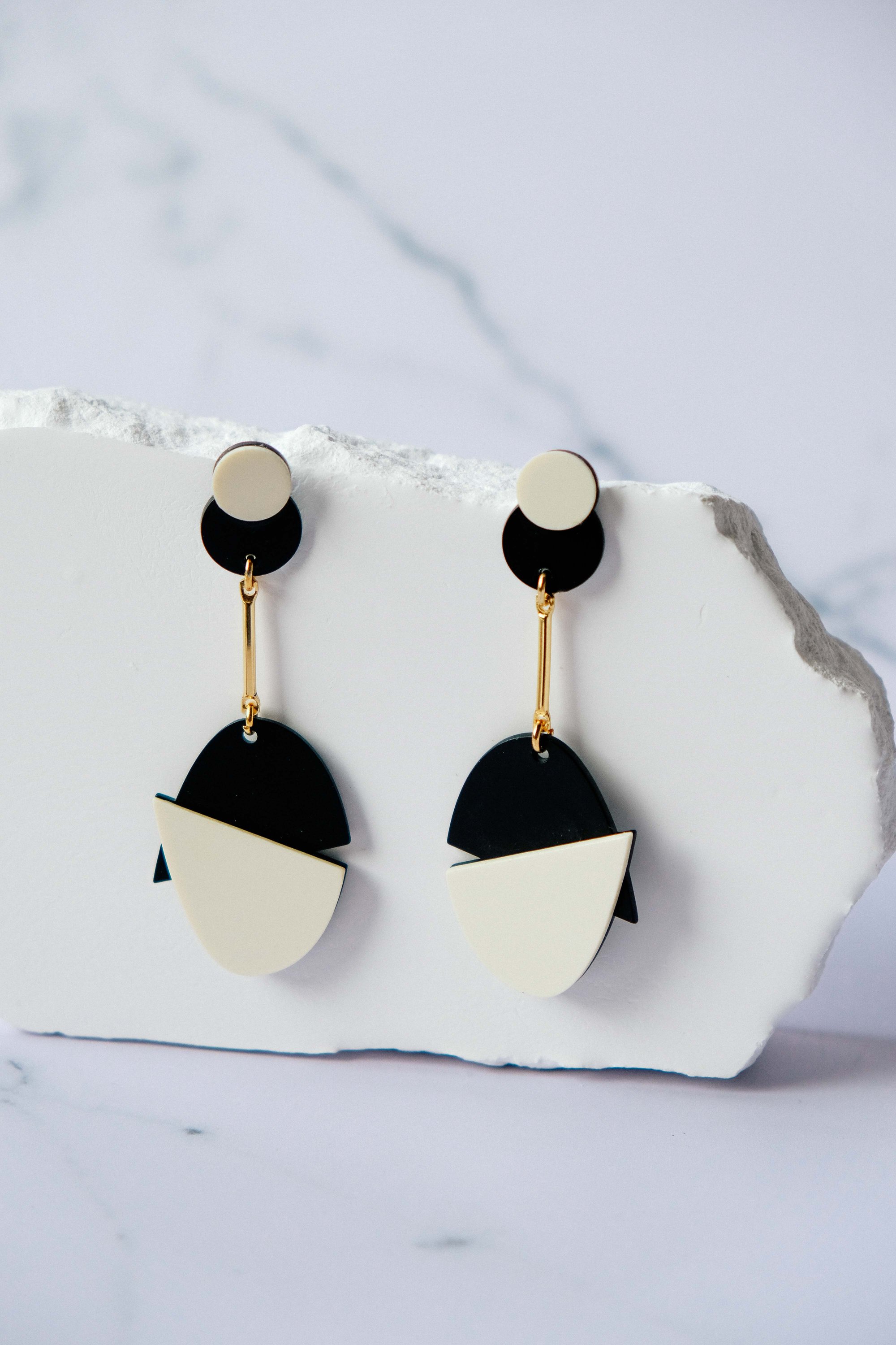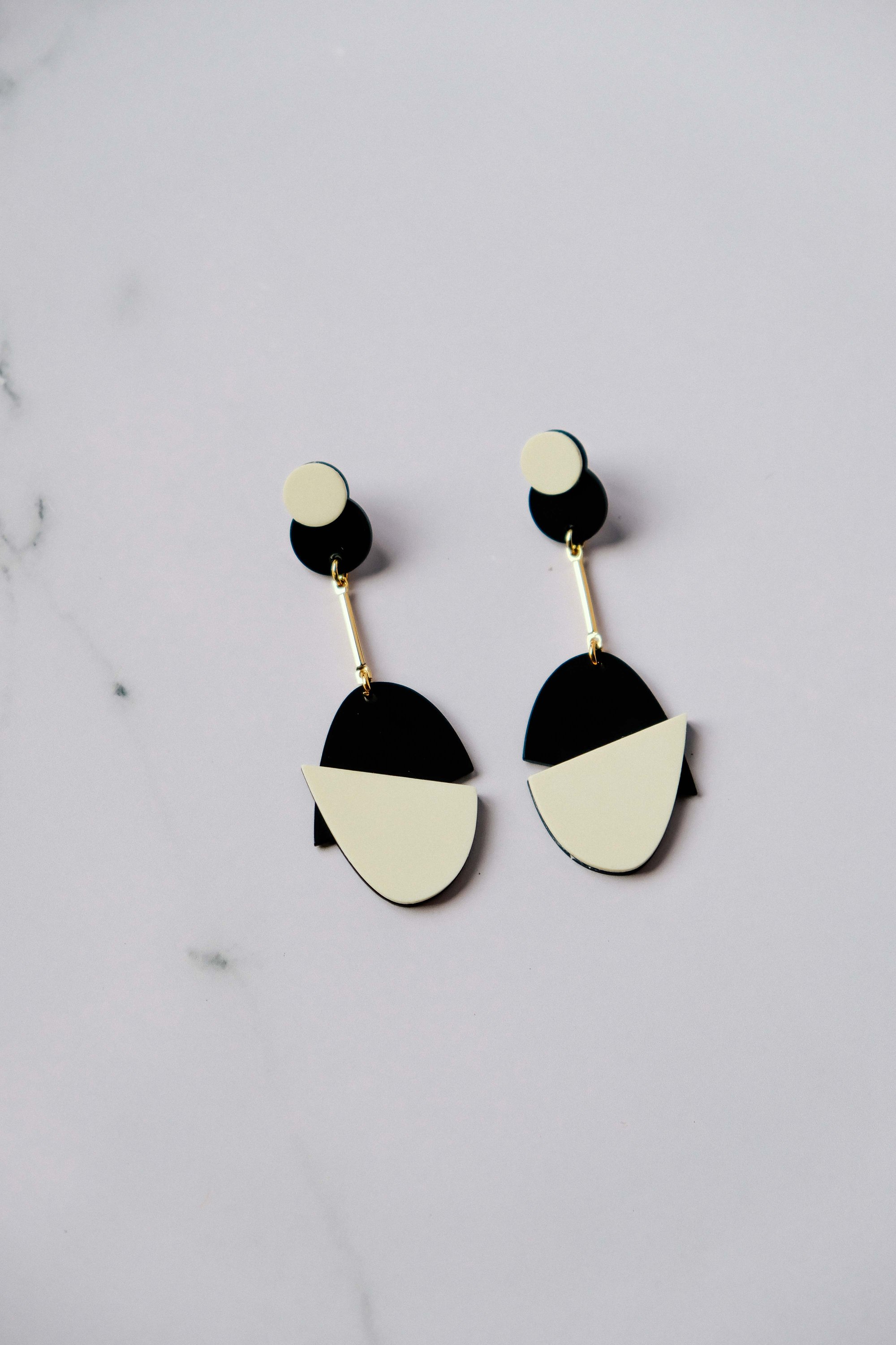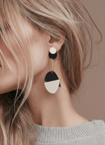 Un diseño depurado basado en los juegos de planos de color de Geneviève Claisse. Su obra se caracteriza por composiciones precisas con círculos y semicírculos que encajan entre sí, tal como ocurre en este pendiente con dos piezas superpuestas en negro y beige. Minimalista, elegante y de líneas extremadamente limpias.