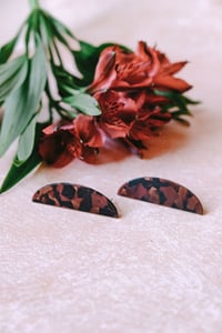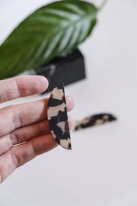 Piezas de acetato de celulosa con acabado mate, pulido y tratado con técnicas de joyería. Esta pieza esta hecha sobre un acetato estampado marron y beige.
