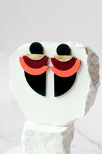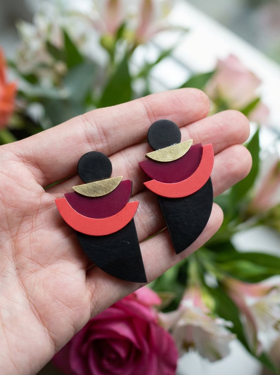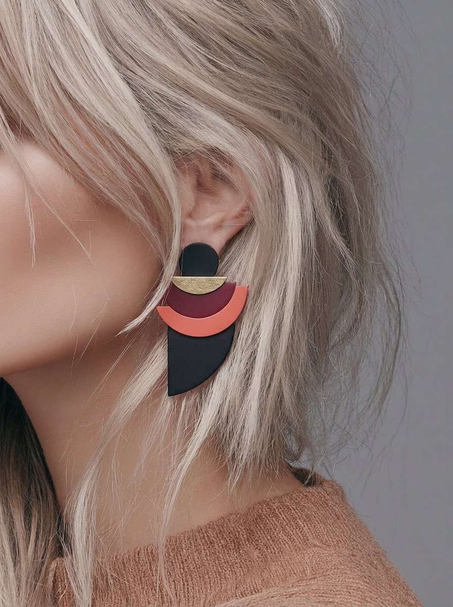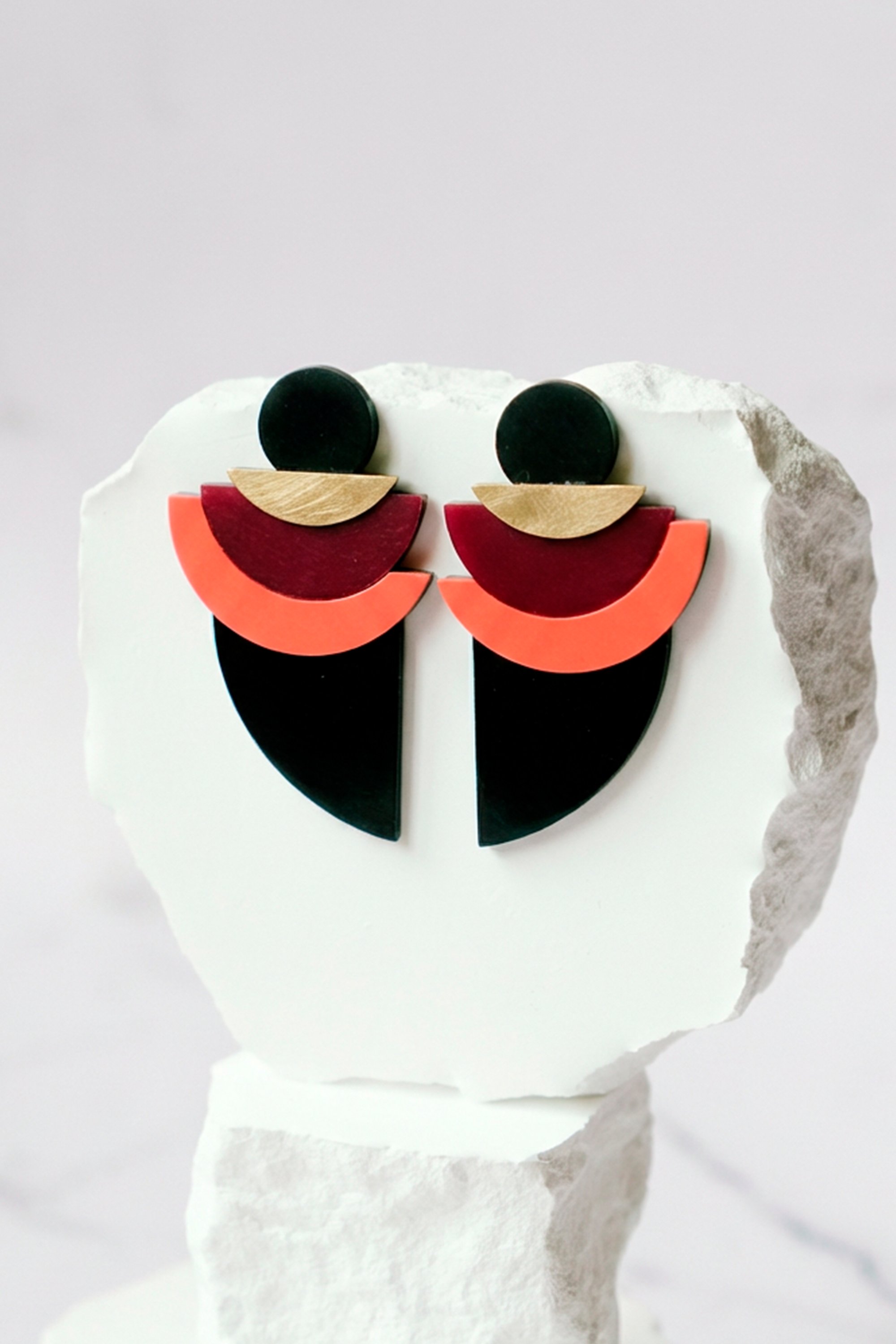 Un pendiente de carácter fuerte inspirado en los colores cálidos, formas curvas y ritmos visuales de Loïs Mailou Jones. Su obra mezcla geometría, cultura y ornamentación, y aquí se reinterpreta en capas superpuestas que crean una figura casi totémica, contundente y expresiva.
